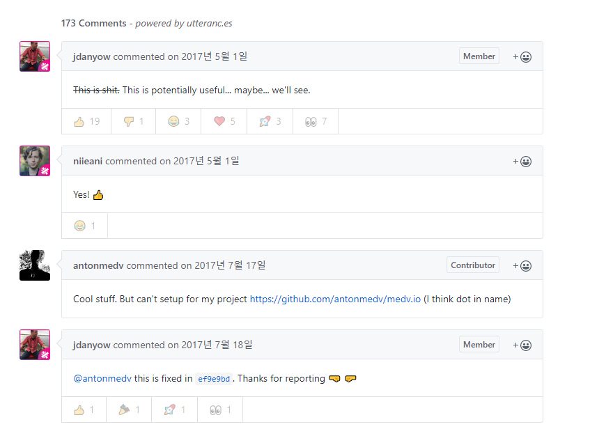 기술 블로그를 열심히 돌아다니던 도중 깃 헙 UI의 신박한 댓글들을 보게 되었습니다. 사실 블로그 댓글 서비스로 페이스북 , 라이브리 등등 다양한 것들이 있지만 그래도 개발자라면 누구나 다 가지고 있는 Github UI의 댓글이 달린다는 것이 참 마음에 들었습니다.