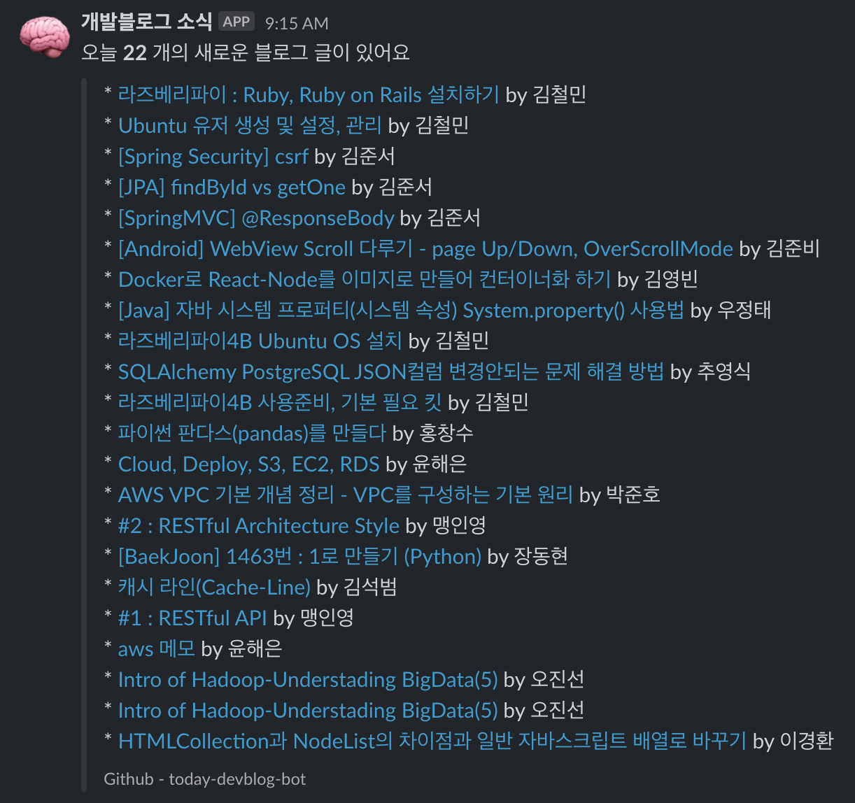 위 토이 프로젝트를 통해 매일 오전 8시에 다양한 주제의 개발 블로그 글들을 슬랙 채널안에서 받아볼 수 있게 되었고, 새로운 주제를 쉽고 빠르게 접할수 있게 되었습니다 😄