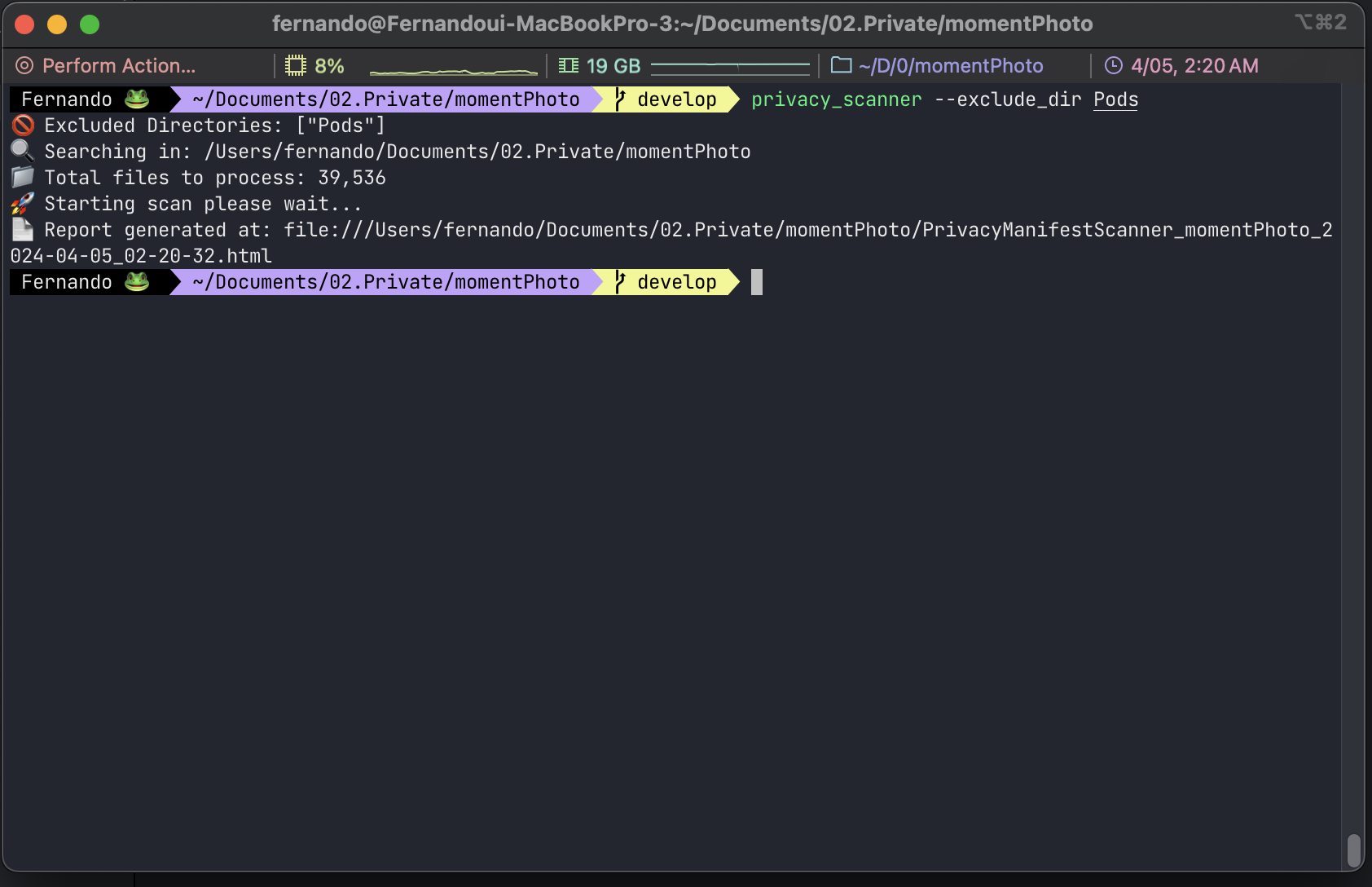 $ privacy_scanner --path ~/Documents/projectFolder --exclude_dir Pods