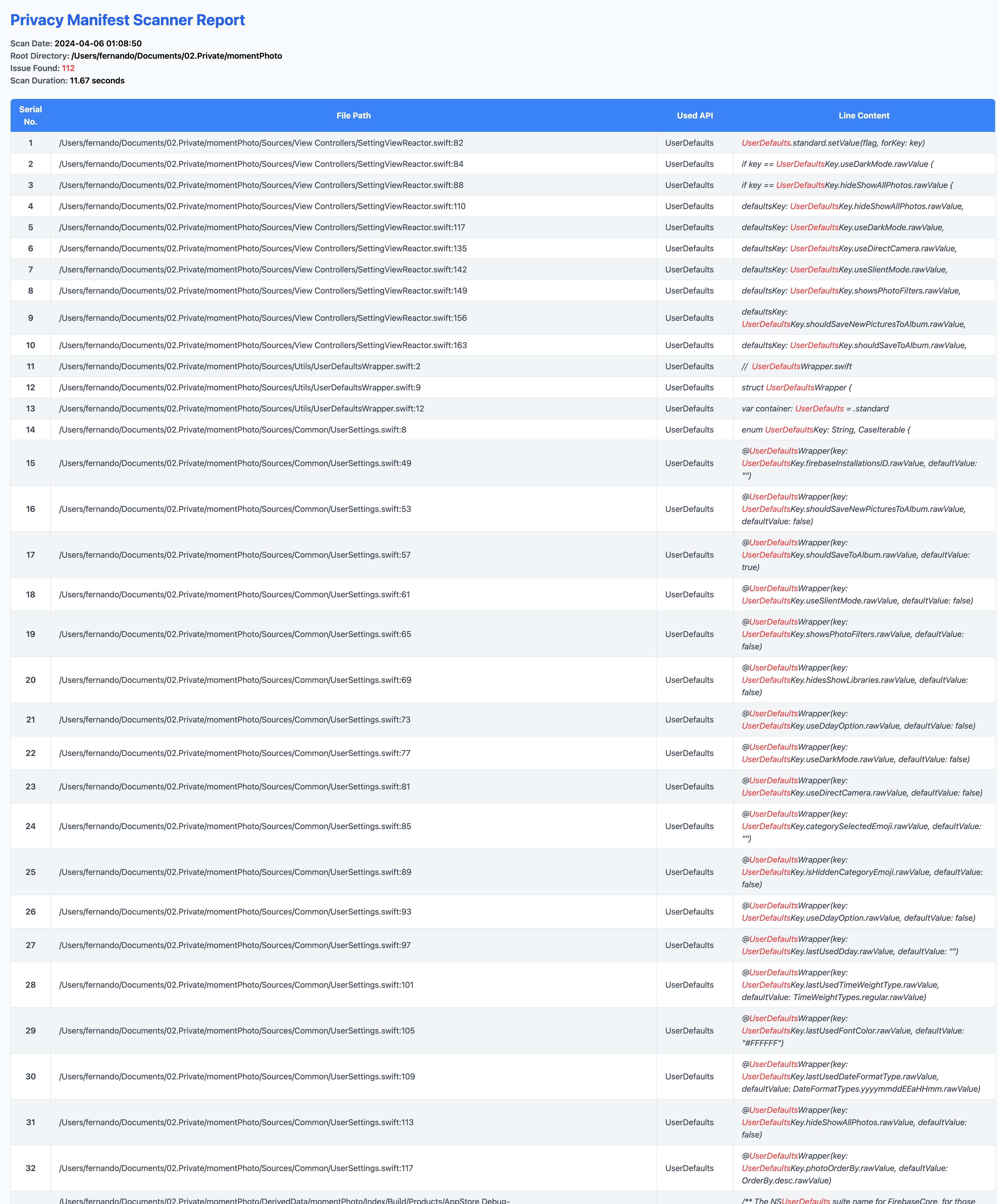 나의 프로젝트에서 사용중인 Required Reason API를 모든 파일을 스캔하여 확인해주고, 해당 결과를 HTML 파일로 리포트 해줍니다. 아래에서 간단한 사용법에 대하여 설명 드리도록 하겠습니다.