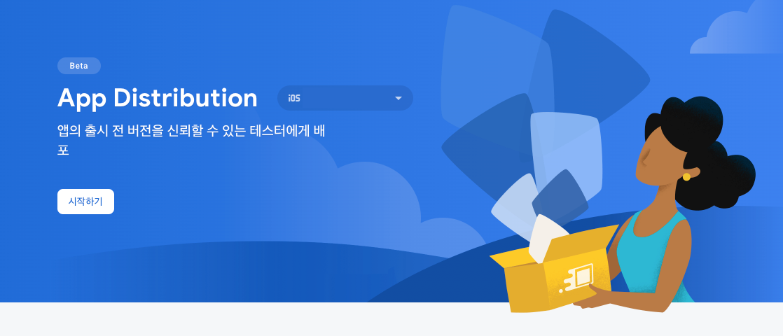 App Distribution 으로 들어오시면 다음과 같은 페이지가 보이실텐데, 여기서 시작하기 버튼을 눌러줍니다.